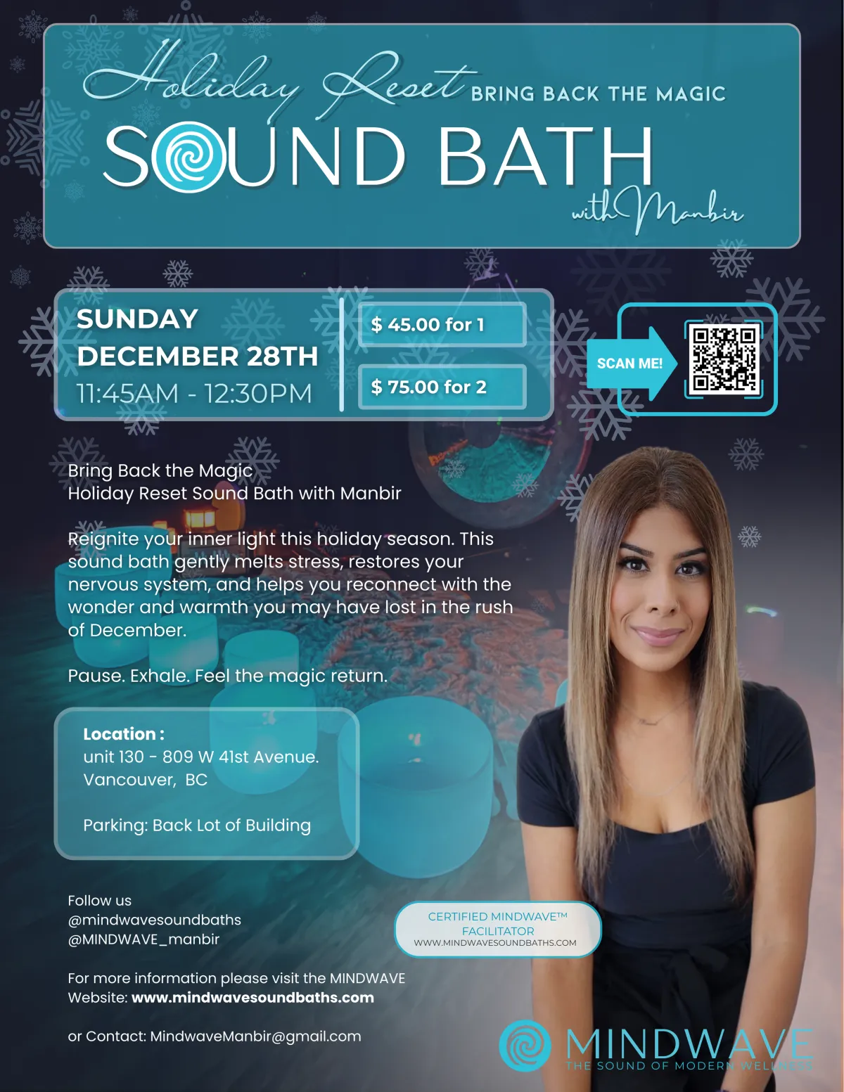 Bring back the magic this holiday season with a restorative MINDWAVE sound bath designed to reset your mind and body. Release stress, reconnect with yourself, and reignite the joy that makes this time of year feel meaningful.